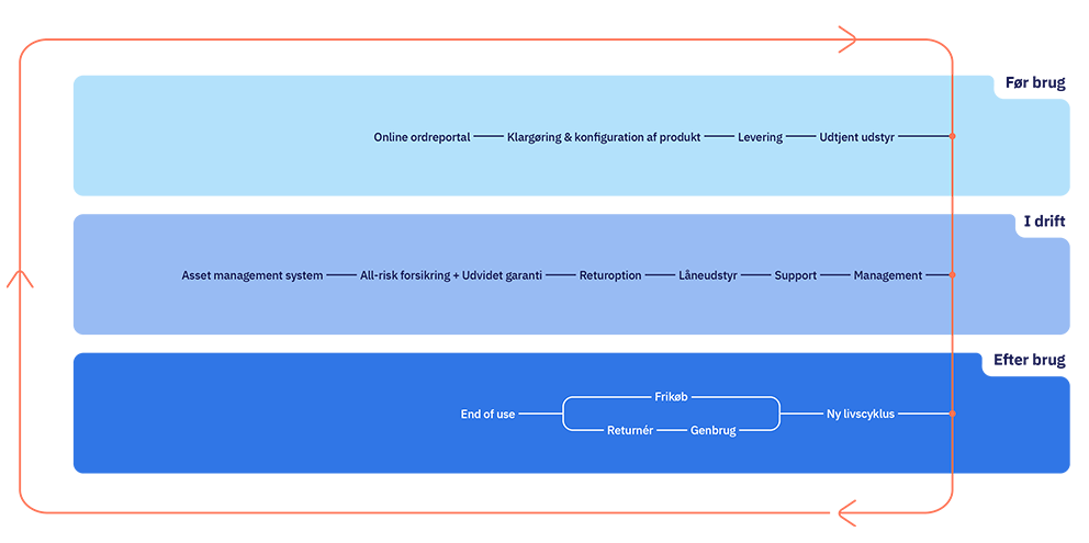 Dit IT-udstyr gennemgår tre faser i dets levetid. Men når du samarbejder med os, er de alle sammen en del af samme flow. Fra vugge til grav til guld. Og forfra igen. Helt enkelt.